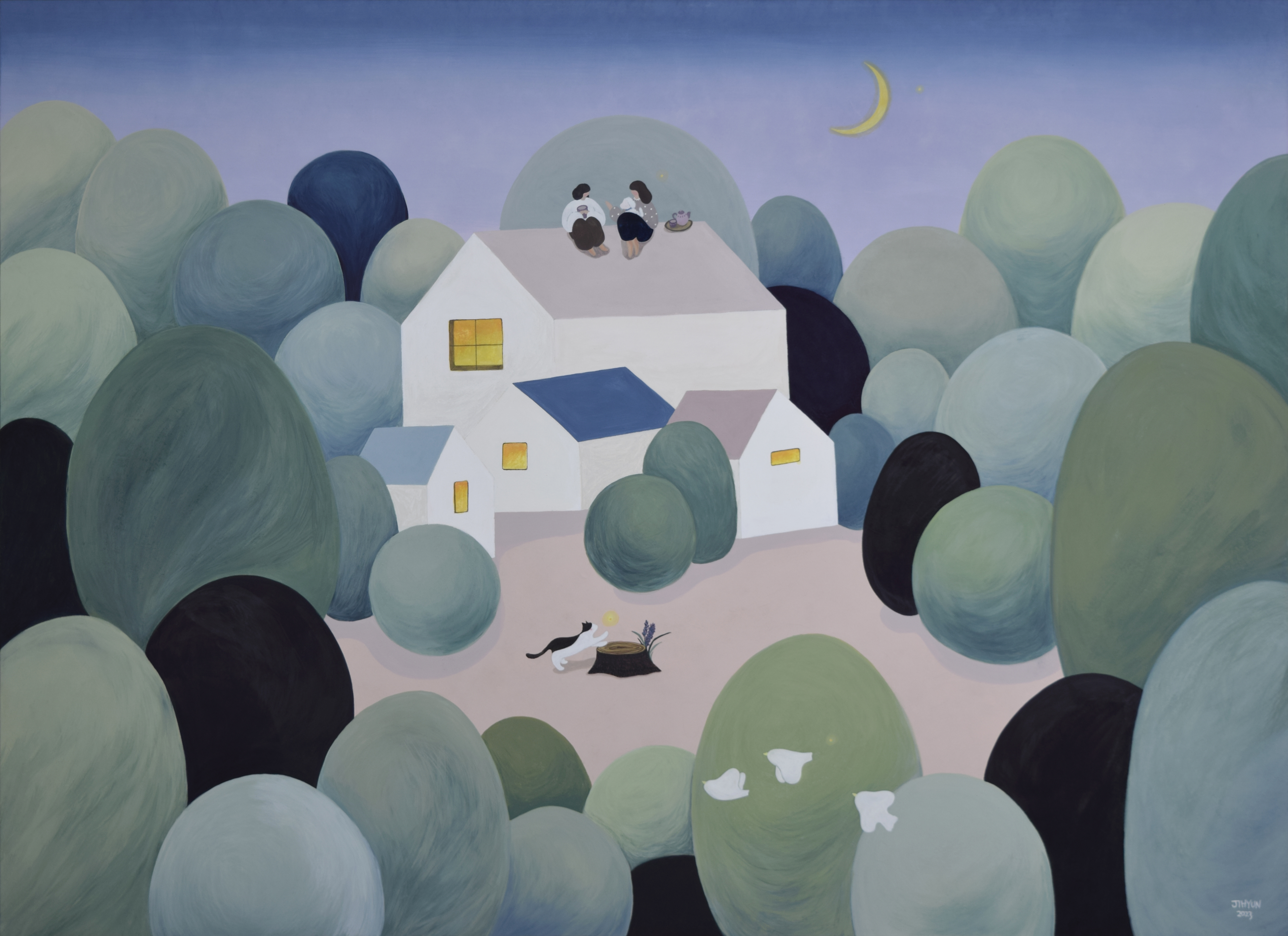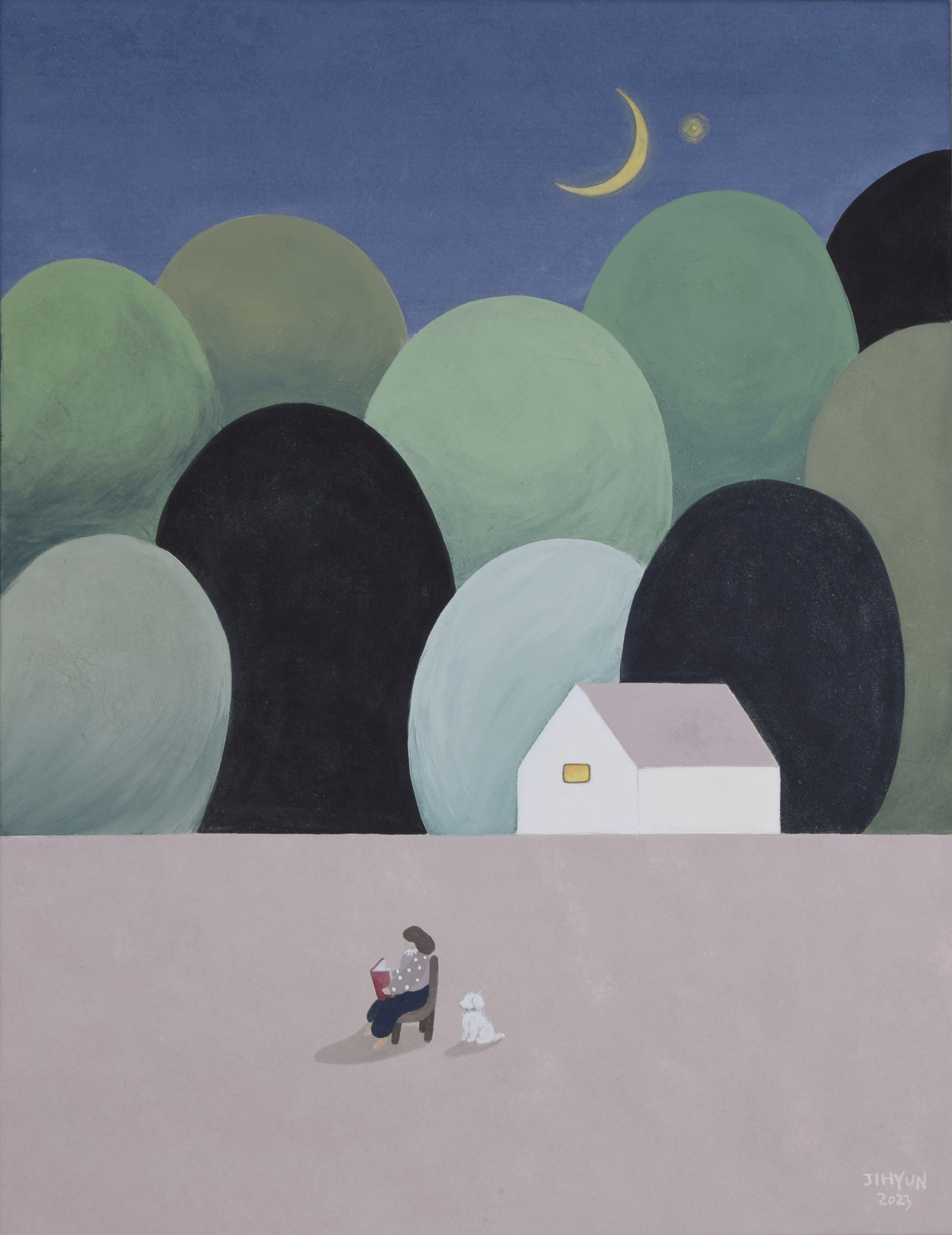 "오래도록 들여다보고 마음과 마주하며 색깔을 채우고 종이의 결을 매만지는 시간을 사랑한다. 그 사랑 안에서 나의 사람들은 영원히 존재하기를 소망하며 다정한 순간들을 모으기 시작했다. 지극히 평범해서 아무도 눈치 채지 못하지만 홀로 빛나던 순간들은 내 기억 속 가장 편안한 장소에서 재구성되어 동화 같은 이야기가 된다. 두 번 다시 만날 수 없는 소중한 존재들은 그리움으로 피어나 달이 되고 일상 속 사소한 웃음들은 다정한 모습으로 나란히 앉아 온기가 되었다. 초록빛 가득한 숲 속에서의 고요함과 달빛 아래 불 밝힌 따스한 집의 포근함은 우리 모두를 지켜주고 보듬어주었다. 서로가 서로에게 존재의 이유인 내 사람들에 대한 이야기. 다정한 순간들을 내 그림 속에 가둬놓고 오래오래 물끄러미 바라본다."