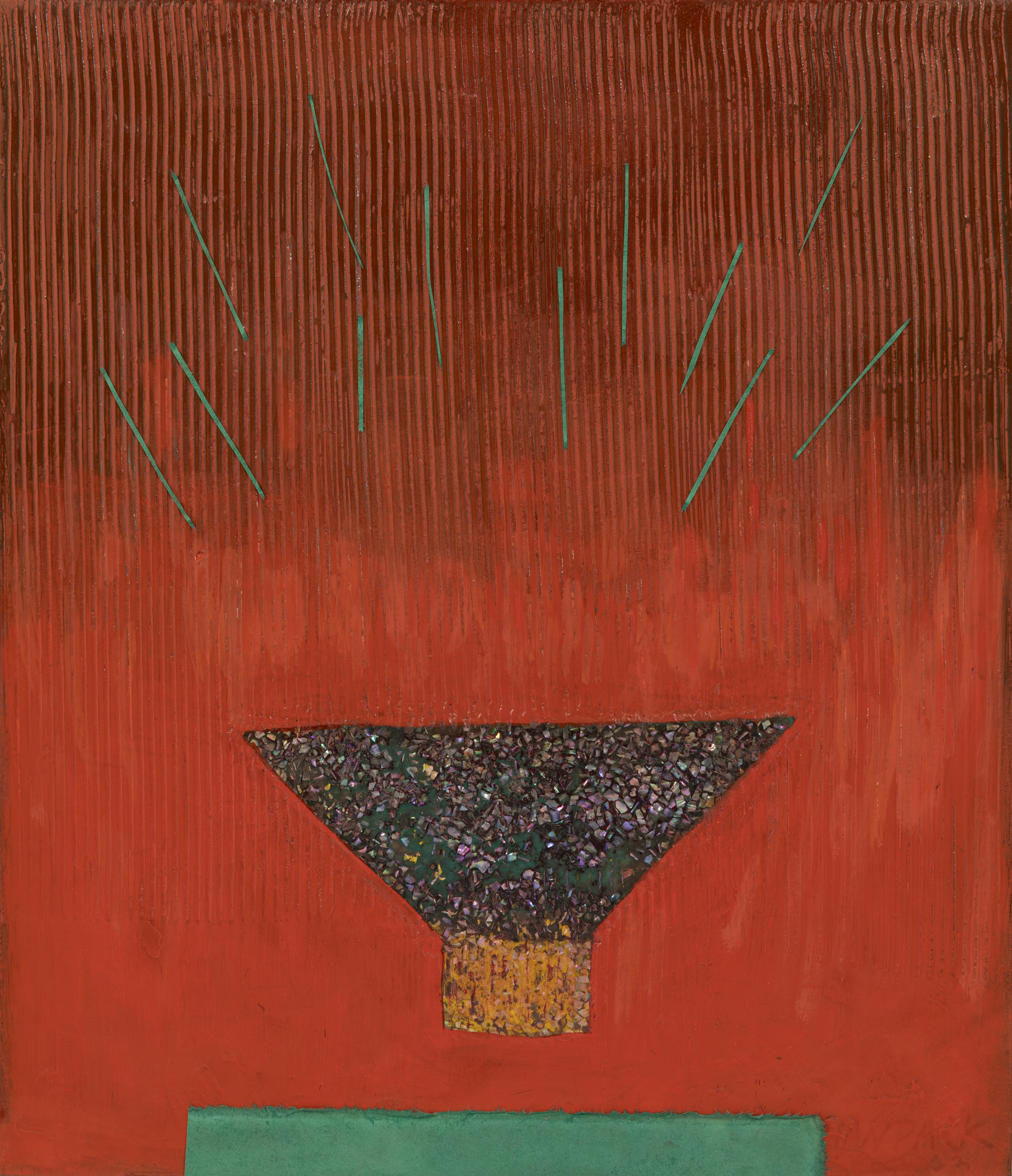 보금자리를 의미하는 ‘텅에’라는 주제를 옻칠재료로 표현한 작품으로 한국적 서정으로 담아내어 편안한 사색이 전해지도록 하였다. 자신의 집이나 어머니의 품속을 비유적으로 하는 말로 쓰이는 텅에 라는 말은 둥우리의 방언으로 어머님의 품을 떠올리게 만든다. 부담 없이 편안하게 쉴 수 있는 보금자리, 그 속에는 소박한 삶의 평화가 잔잔하게 흐르고 있다. 심리적 안정은 사람들의 자연스러운 욕구이다. 안락함을 추구하는 것 역시 불안정한 상태를 극복해 내려는 의지의 방식이다. (중략) 고향을 그리는 마음과 새로운 둥지를 고향 삼아 살아가는 마음이 묘하게 부딪히던 심경을 표현하며 ‘내 마음이 편한 곳이 내 보금자리가 될 수 있다’는 심적 표현을 조형화 하고자 옻칠기법을 이용하면서 서정적인 감성을 발산시켰다. 칠의 기능성을 예술성으로 이끌어내어 소박한 삶의 심리적 안정을 안겨줄 수 있는 이미지를 전달하고자 한다