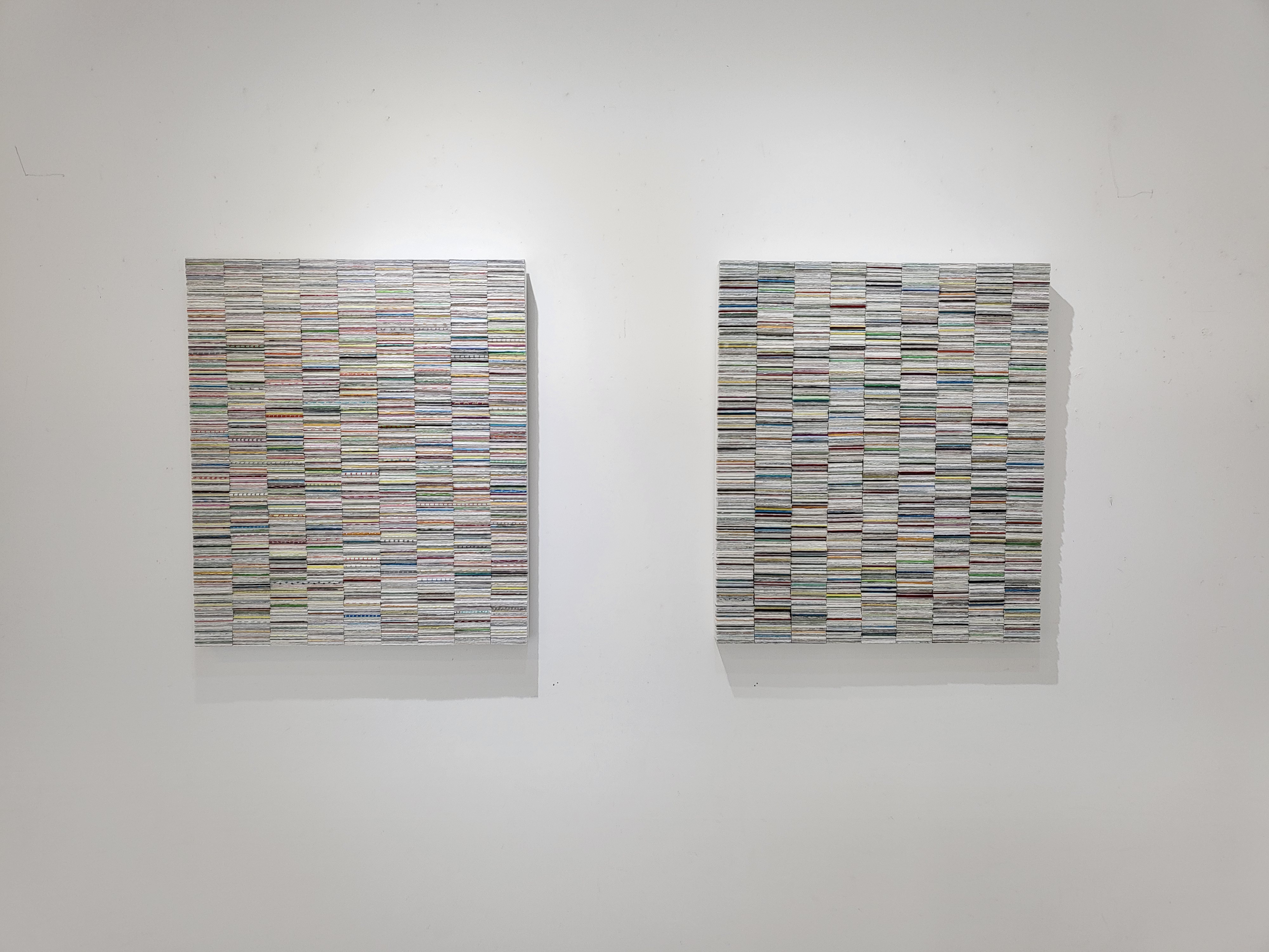책은 형태와 소재만으로도 훌륭한 예술적 가치를 지니고 있다. 다양한 크기와 소재들로도 멋진 구성을 이루어 낼 수 있기 때문이다. 한권의 책이 만들어지기 위해서는 서로 성질이 다른 재료들이 쓰여 지는데, 나는 그렇게 만들어진 책을 해부하여 새롭게 평면적으로 표현해보려 하였다.