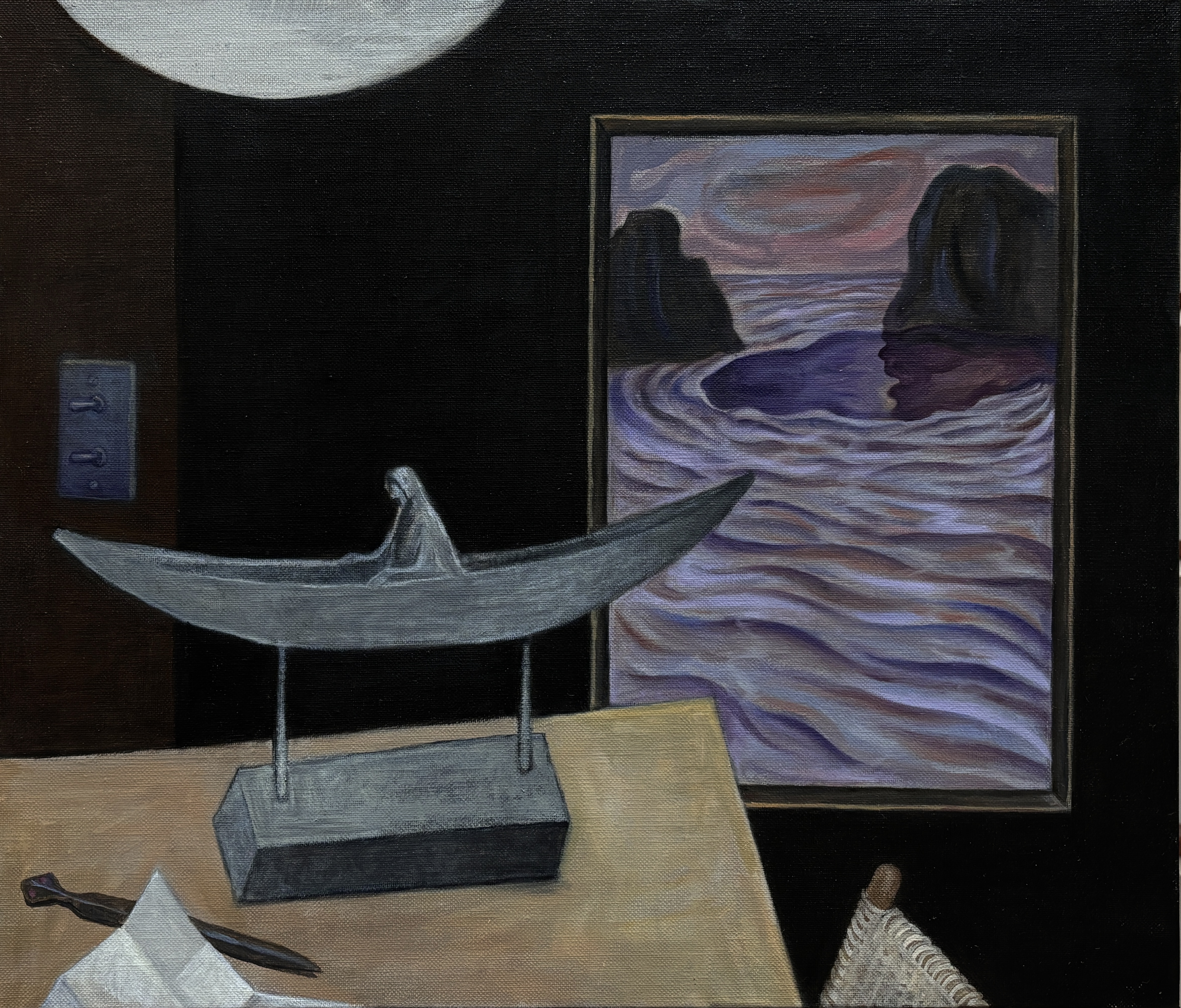 고요한 바다 그림을 지나 프레임 밖으로 흘러가는 배.