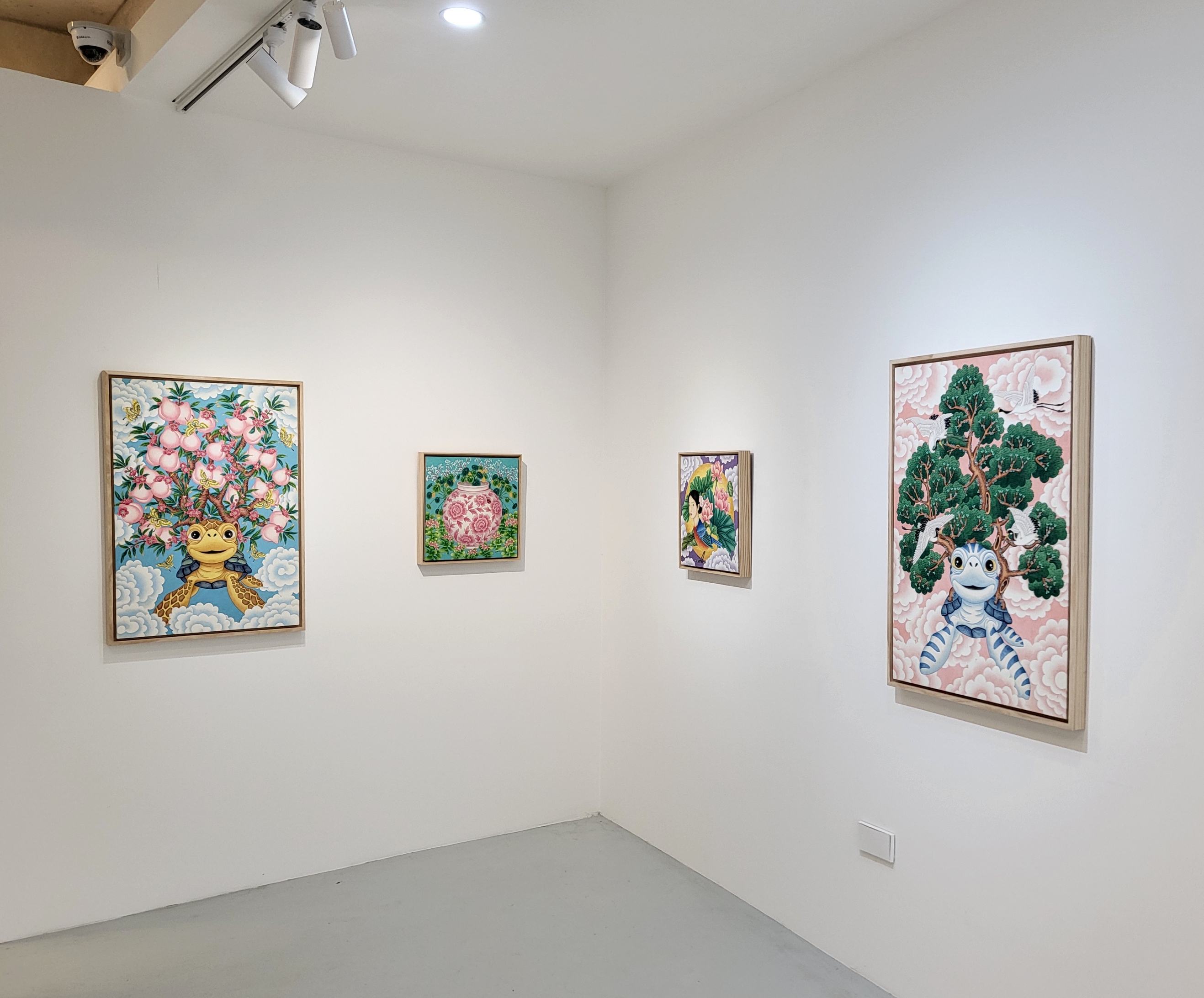 This fascination naturally led me to explore symbols and stories within Korean tradition that are still alive today, which became the foundation of my work. In the past, people created fierce-looking mythical creatures to ward off misfortune in uncertain times. In my paintings, however, they return as friendly companions who still carry sacred power while offering protection. I call them my “Guardians” or “Protective Friends,” because they were the beings who stood by me during the difficult days of the pandemic, giving me the strength to begin again.