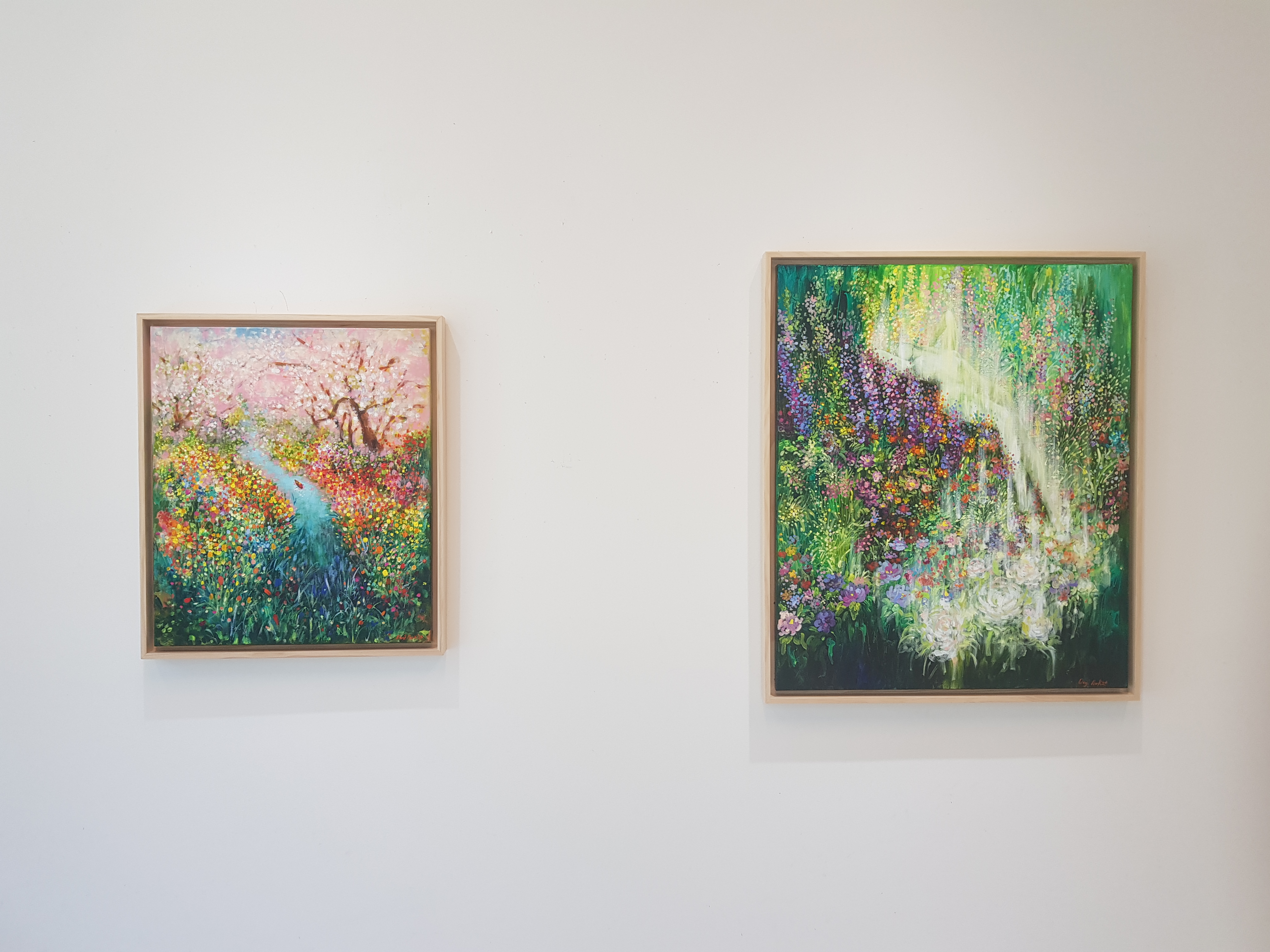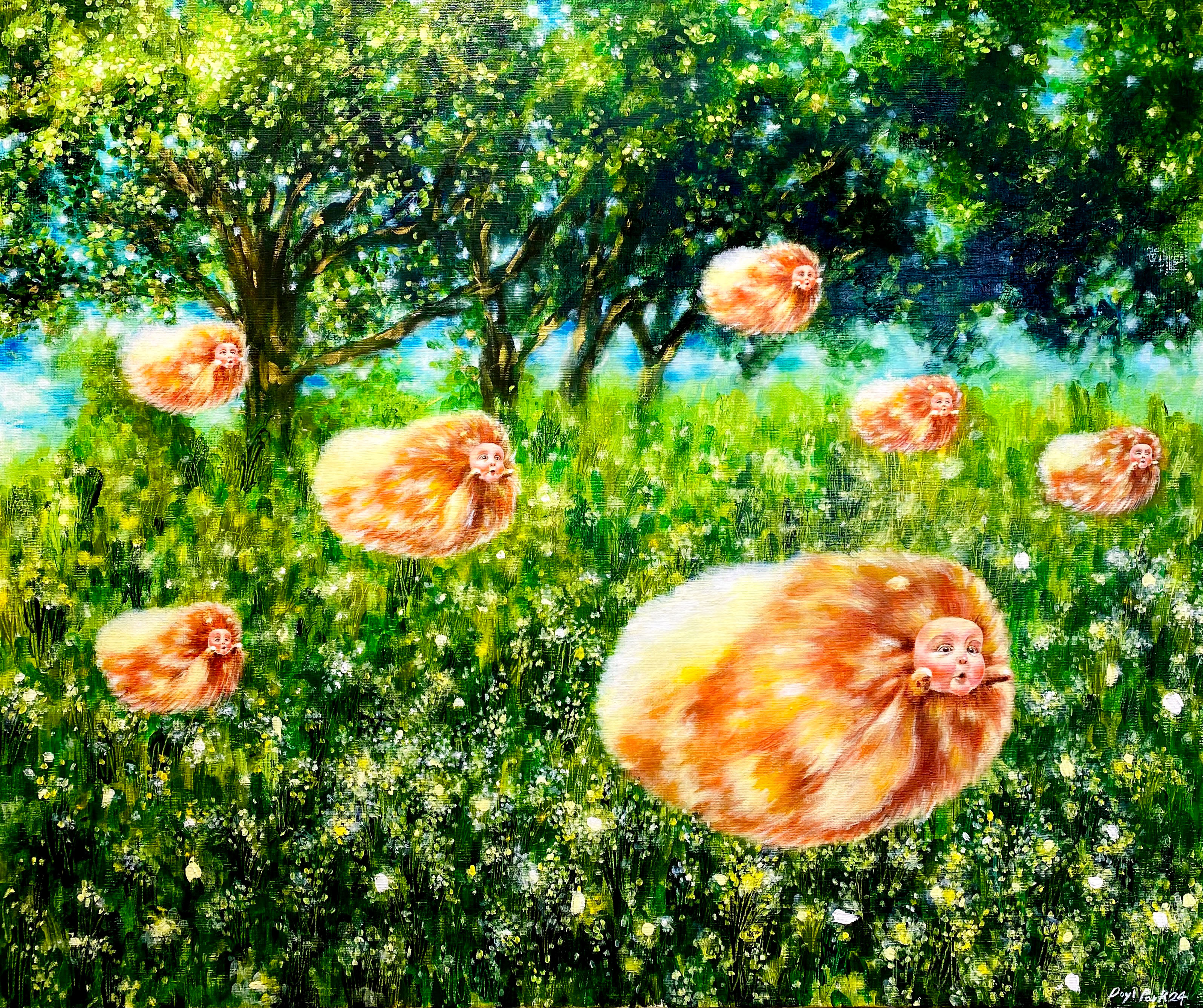 ✔ 작가노트 ㅣ 나에게 봄은 티 없이 맑고 깨끗한 아이 같은 계절이다. 이 생기 가득한 계절엔 풋풋한 설렘, 새로운 시작, 화사한 생명력, 맑은 마음들이 사랑스러운 기운을 품고 태어난다. 겨울잠을 끝내고 태어난 봄의 생명력은 평범한 일상에서도 좀 더 여유롭고 풍성한 마음을 지니게 하는 것 같다. 발길 닿는 곳마다 꽃이 피어 있듯, 마음속에 가득 피어난 꽃들은 세상의 아름다움을 더 깊게 느끼게 하고, 삶의 모든 순간을 더욱 반짝이게 만든다. 이 따스함 속에서 나는 내가 보고 느낀 사랑스럽고 화사한 순간과 감정에 집중하여, 그 순간이 영원해지길 바라며 구름 형태의 꽃과 자연의 모습으로 진심을 담아 붓칠을 해보았다. 느낌의 묘사에 집중한 이번 작품들은 그저 손이 가는 대로 아이처럼 자유롭게 화폭 속에서 유영했다. 화창한 계절을 닮은 작품을 선보이고 싶었던 나의 바람이 마음속에 순수한 행복과 화사한 꽃들을 피우게 하길 바란다.