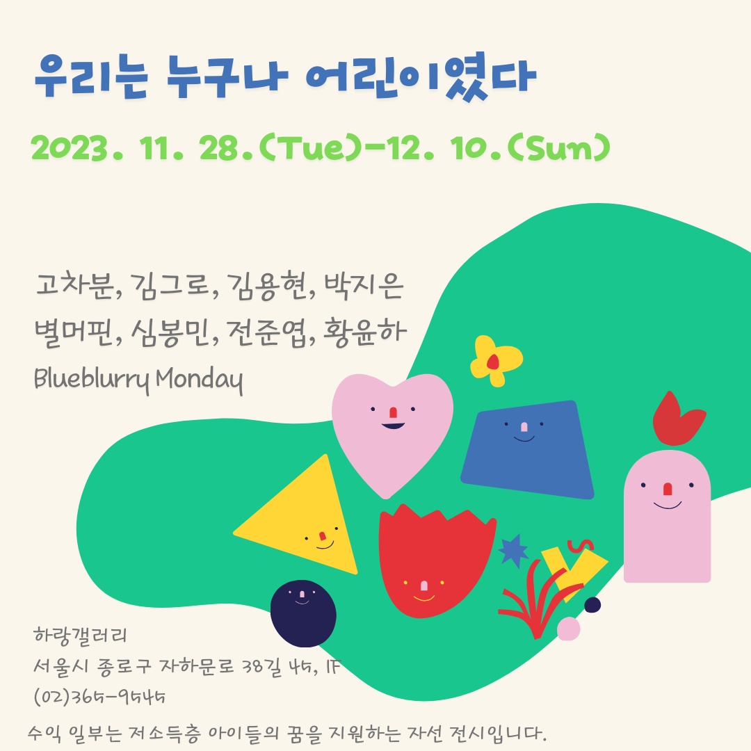 우리는 모두 한때 어린이였습니다. 흰 벽지를 알록달록한 색깔로 칠했었고, 잠들기 전 그림책을 보며 꿈을 키웠습니다. 하랑갤러리는 국내 저소득층 아이들의 꿈을 지원하는 연말 자선 전시회에 여러분을 초대합니다. 수익 일부는 아이들이 더 큰 창의력을 발휘할 수 있도록 저소득층 아동들에게 스케치북, 색연필, 크레파스 등 문예 창작활동 키트와 그림책을 지원할 예정입니다. 따뜻한 관심 부탁 드립니다.