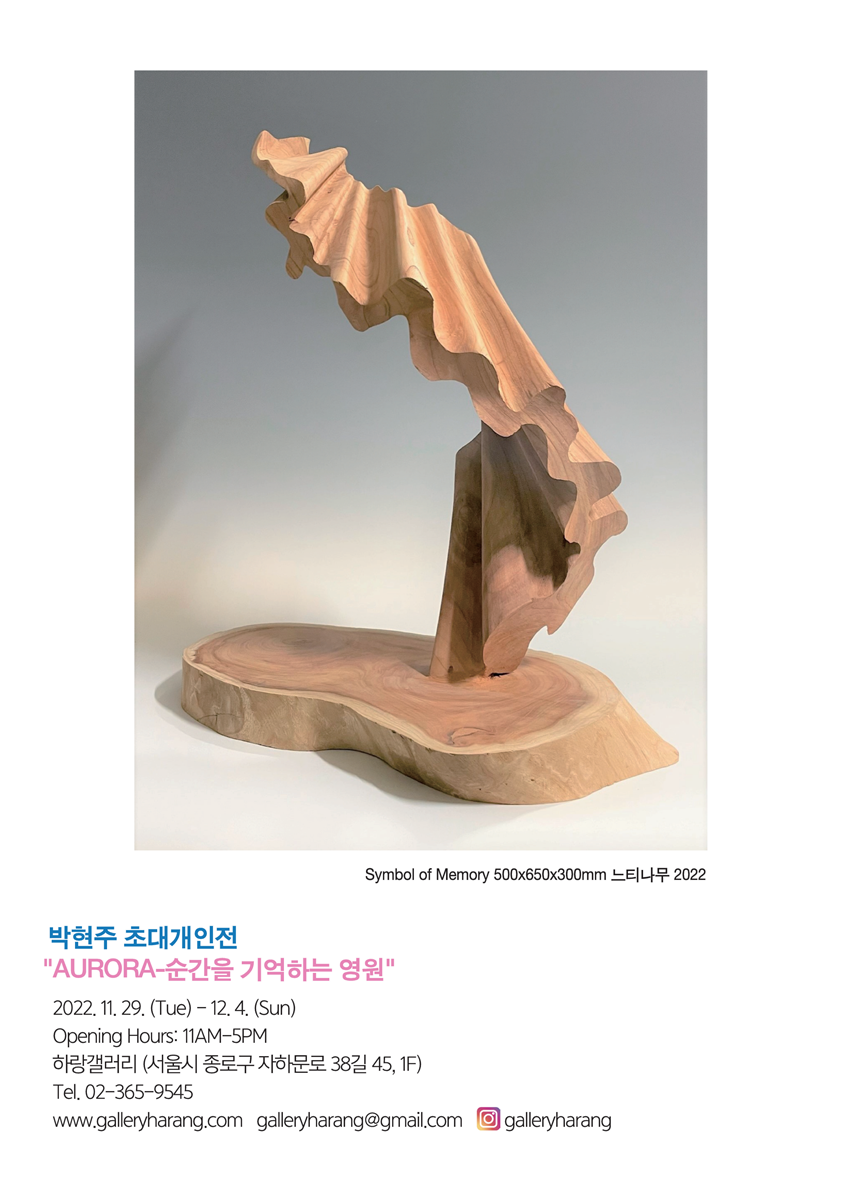 작품 〈Symbol of Memory, 메이플〉은 목판의 평면을 깎아 그 위에 마치 ‘커튼의 주름’과 같은 부조를 살포시 올린 작품이다. 대기 위를 운위하는 오로라의 움직임이 커튼처럼 접히고 펼쳐진 이 작품은 일견, 오로라의 유려한 변화의 움직임을 효과적으로 담아내기에는 역부족인 것처럼 보인다. 이러한 조각은 어떻게 보면, 움직이는 시간을 마치 인상파 회화처럼 일시적으로 정지시켜 포착하는 방식의 조형 언어 외에 다른 방식을 구사하기가 쉽지 않아 보인다. 어떤 면에서는 정이나 끌로 나무의 표면을 깎아 오목의 지평을 만드는 조각(彫刻)의 카빙(carving)이라는 네거티브 방식에 골몰하거나 석고나 주물을 통해 볼록의 매스를 일으켜 세우는 소조(塑造)의 포지티브 방식에 집중하는 것이 전부인 것처럼 보이기도 한다. 물론 오브제를 통한 아상블라주의 미학이나 설치 나아가 무형의 콘텐츠 중심의 개념적 조각이 있기도 하지만, 비교적 조각의 언어는 투박하고 정직하기까지 하다. 그러나 박현주의 이 작품은 생성과 소멸의 시간성을 변화무쌍하게 오가는 오로라를 ‘나무 위에 포착하여 박제화’하기보다 하나의 상징처럼 기호화하기를 시도한다. 따라서 그녀의 작품은 인상파가 던졌던 ‘임시적 시간의 구현’이 아닌 ‘지속적 시간의 상징적 표상’이라는 의미심장한 미학을 품어 안는다. 이러한 차원에서 나무, 철, 돌과 같은 정직한 재료는 기호와 상징을 표상한다는 점에서 오히려 효율적인 그릇으로 자리하기에 이른다. 또 다른 작품들을 보자. 일련의 〈Symbol of Memory〉라는 제명의 연작들은 우리가 앞서 언급했던 부조 형식의 조각을 넘어서 삼차원 공간을 적극적으로 점유한다. 나무나 스테인리스 스틸 재질로 만들어진 이 작품들은 마치 연기나 대기의 흐름을 구불구불한 형상으로 표현한 모습으로 오로라에 대한 상징으로 표상된다. 박현주의 이 연작은 극지방의 대기 공간을 점유한 오로라를 삼차원 조각체로 구현하되, 그것의 흐름을 기호화했다는 차원에서 ‘시간에 대한 상징’으로 규정해 볼 수 있다. 또 다른 작품들에서 보듯이, 때로는 수직의 ‘빗살무늬’로 때로는 부챗살처럼 펼쳐지거나 하늘을 오르는 듯 소용돌이치는 오로라 이미지 등을 통해서 박현주의 일명 ‘오로라-시간’은 효율적인 하나의 상징으로 자리한다. 이 연작의 제명이 모두 ‘기억’이라는 단어를 중심에 두고 있다는 점에서도 이러한 시간의 상징성은 더욱더 강하게 드러난다. 박현주의 ‘오로라-시간’ 혹은 ‘오로라-기억’은 분명 오로라에 대한 개인 체험으로부터 비롯된 것이지만, 모든 인류가 대면하는 과거-현재-미래를 잇는 모든 시간으로 확장한다. 우주의 탄생과 지구의 생성 그리고 지구의 미래까지 아우르는 시공간이 집적된 상징으로서 말이다. 이러한 차원에서 그녀의 작업이 ‘생명 에너지’라고 하는 오로라의 근원적 상징성에 주목하고 있음을 되새겨 볼 일이다. ‘오로라로 대별되는 상징’에 접근하는 박현주의 작업 태도는 베르그송(Henri Bergson)이 언급했던 ‘이미지-기억(souvenir-image)’의 차원에서 검토되기에 족하다. ‘이미지-추억’으로 번역되기도 하는 베르그송의 ‘이미지-기억’이란 ‘습관-기억(mémoire-habitude)’과 대립하는 개념이다. ‘습관-기억’은 글쓰기나 피아노 연주처럼 반복적 노력이나 실험 등을 통해서 가능한 기억으로 언제나 무의식적으로 재현되는 것이지만, ‘이미지-기억’은 어떠한 작위적인 노력 없이 강렬한 경험으로 인해 저절로 인간 주체에게 보존되었다가, 현재의 자극이나 요청에 따라 자유롭게 이미지 형태로 떠오르는 기억이다. 그 경험이 강렬하면 강렬할수록 기억은 인간 주체에게 ‘이미지-기억’으로 지속적으로 현현한다. ‘습관-기억’이나 ‘이미지-기억’ 모두 우리 몸의 기억이라는 점에서, ‘순수 기억’(mémoire purifiée)이다. 순수 기억은 현재로부터 역순하여 분절되는 특정 시공간이기보다 생명과 물질