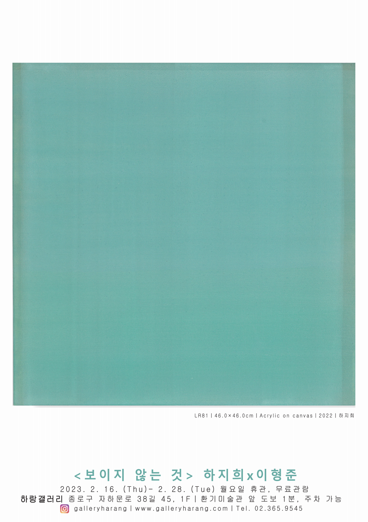 <보이지 않는 것> 하지희x이형준 2023 상반기 신진작가 공모선정 기획전 2월 16일(목)-2월 28일(화) 관람시간 11시-5시 (입장 마감: 4시 30분, 무료관람) 전시 및 작품리스트 문의 (02) 365-9545, galleryharang@gmail.com, Instagram: galleryharang 매주 월요일 휴관, 환기미술관 앞 도보 1분(주차 가능)