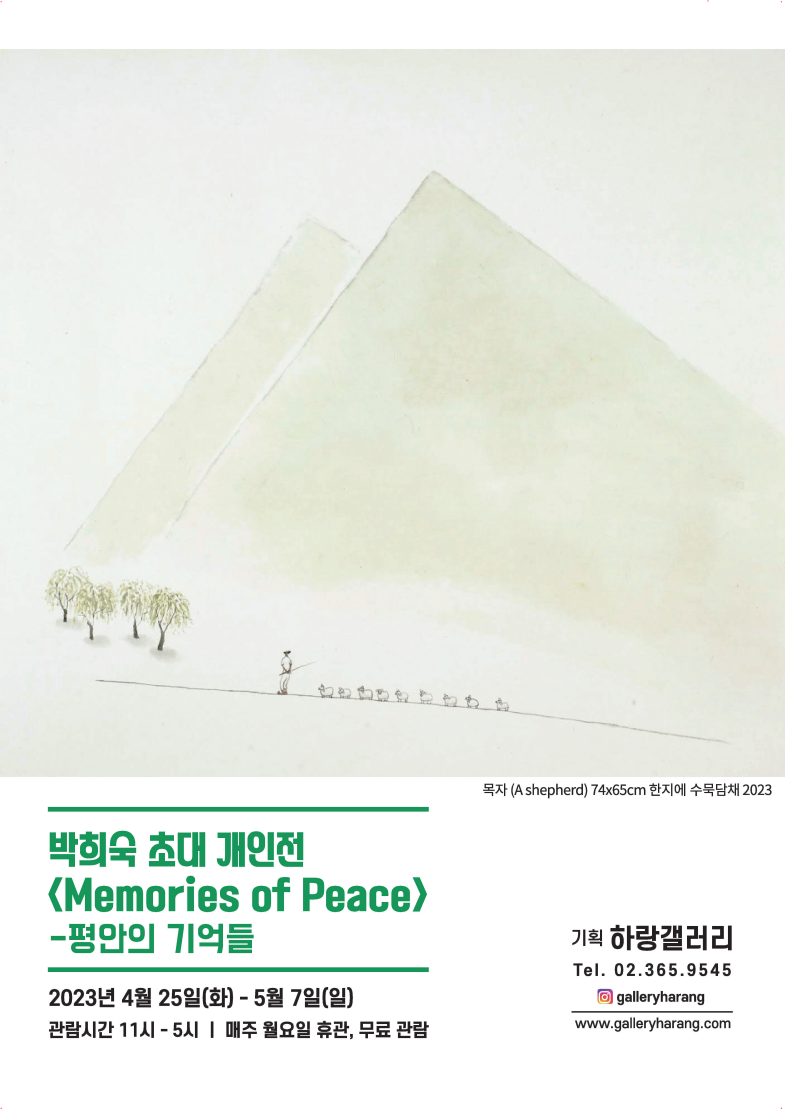 <기억의 풍경> 심봉민x박지현 3월 17일(금)-3월 30일(목) 관람시간 11시-5시 (매주 월요일 휴관, 주차 가능) 전시 및 작품리스트 문의 (02) 365-9545, galleryharang@gmail.com, Instagram: galleryharang 하랑갤러리 (종로구 자하문로 38길 45, 환기미술관 앞 도보 1분)