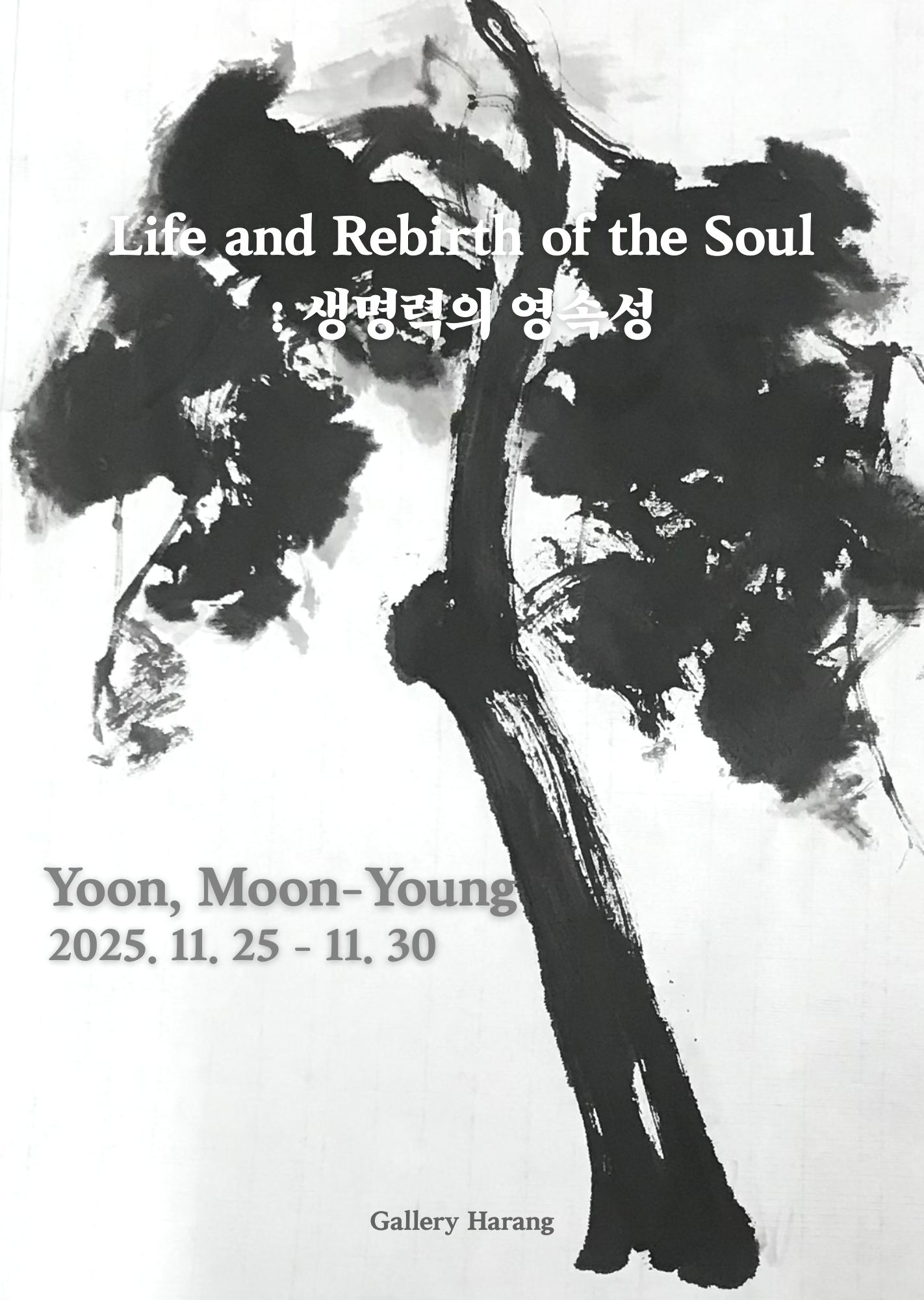 전시 기간 ㅣ 2025.11.25.(Tue)- 11.30.(Sun) 소개ㅣ 작가 윤문영은 자신의 핵심 주제인 자연의 생명력(SOUL)을 동양화의 창작 원리인 ‘형사(形似)’와 ‘신사(神似)’에 접목시켜, 나무(木)라는 상징적 매개체를 통해 표현하고자 한다. 즉, 탄생‧소멸‧재생으로 이어지는 생명의 순환을 나무라는 형식과 내용 안에 담아, 작가의 심상과 이론을 시각적으로 풀어내고자 한 것이다.