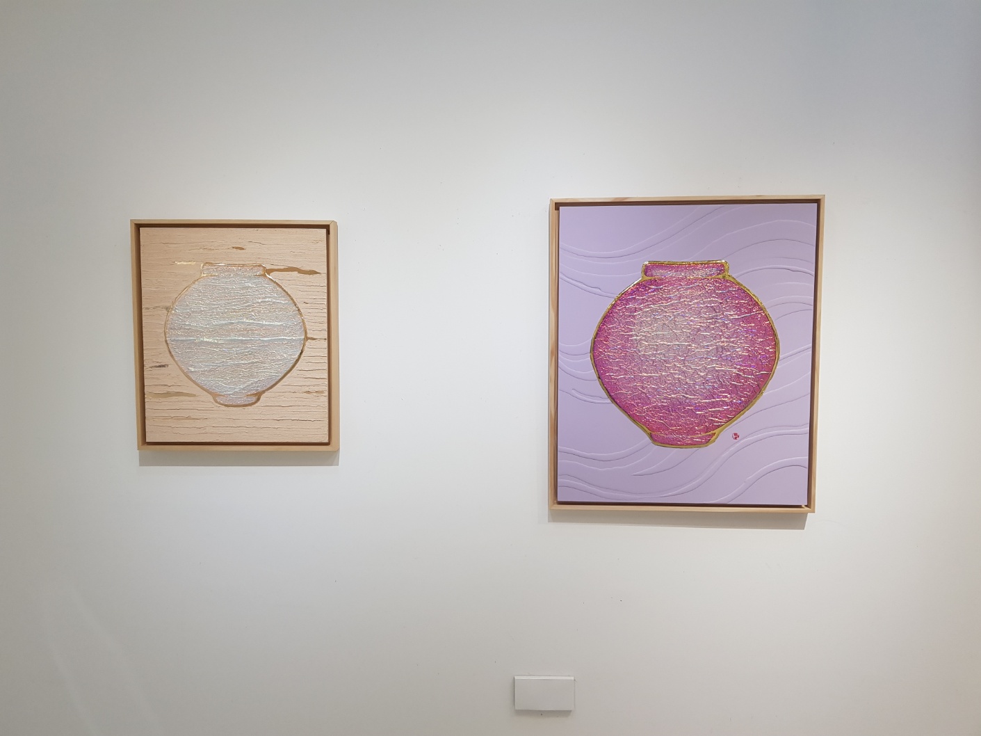 작가 소개 손수경 작가는 순수 자연물로 이루어진 옻칠재료를 이용하여 칠의 기능성을 예술성으로 이끌어내어 회화적인 맛을 살린다. (중략)작가는 옻칠을 올리고 갈아내는 작업을 수개월 동안 반복하며 달항아리를 옻칠로 올렸다. 옻이 지닌 신비롭고 단아한 색감이 보는 이릐 마음을 평온하게 감싸준다. 우리의 많은 삶처럼 달항아리의 다양한 변주를 공간과 단면으로 표출하여 그 가운데서 소망과 기대, 정화, 휴식 같은 긍정적인 에너지를 끌어내어 본다.