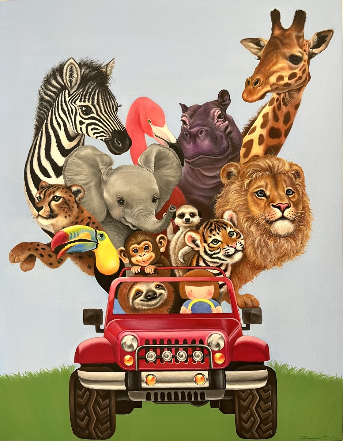 정은정 작가의 작품에는 사람처럼 자동차나 오토바이를 타며 신나게 드라이브를 즐기고 있는 동물들의 모습이 표현되어 있다. 인간의 문명 속에서 인간인 듯 생활하는 야생 동물의 모습을 형상화 한 것이다. 현실 세계에서는 절대 일어날 수 없는 상황을 통해 유쾌하고 에너지 넘치는 동물들이 모두 오색 창연한 색으로 공존하기를 바라는 작가의 낙관주의적인 미학적 태도가 담겨 있다. 인간의 과욕으로 사라지는 멸종위기 동물, 반대로 인간의 위로를 위해 더 많이 번식되고 버려지는 반려동물, 해맑게 웃고 있는 어린 아이의 모습은 더 이상 친구들을 해치지 말고, 함께 살아갈 수 있도록 하자고 이야기하는 것 같다.