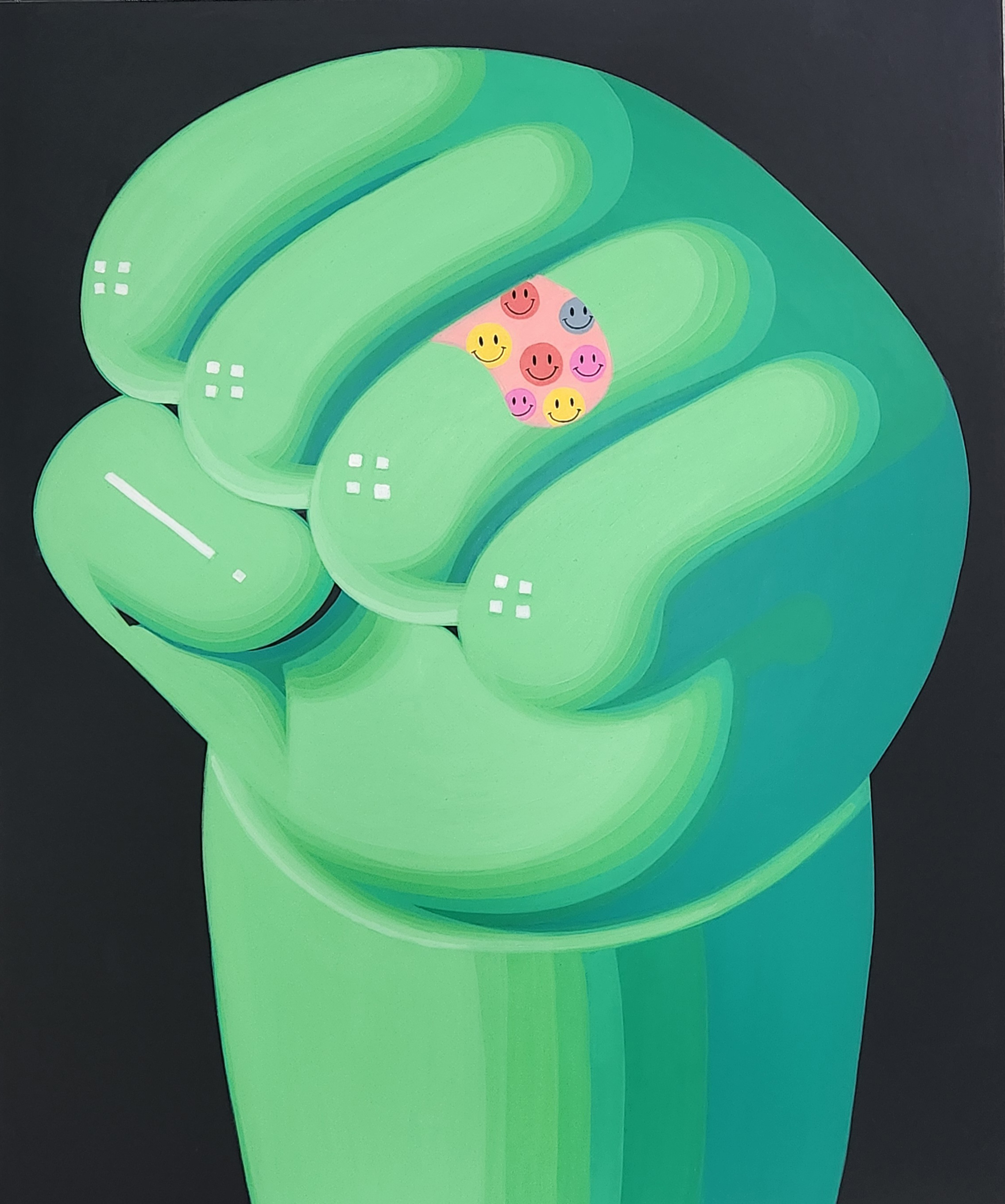✔ 작품 문의 ㅣ(02)365-9545, galleryharang@gmail.com, Instagram (@galleryharang) ✔ Intro 김인 작가는 그 동안 가상 공간의 캐릭터인 아톰과 인간의 공존 등과 같은 문화적, 미학적 쟁점들을 효과적으로 해석해 왔고, 이번 전시에서도 가장 현대적인 소재와 미래 지향적인 주제로 꿈, 의지, 낭만을 담은 작품세계를 선보인다. 아톰의 주먹은 그를 대표하는 그림이 됐다. ‘어두운 책장 밑에서 발견된 아톰의 주먹은 그 당시 나의 정신과 닮아있었다’며 ‘고난과 시련에 피하지 않고, 이겨나가야 한다는 부분들이 인상적으로 다가왔고, 작가로서나 삶을 살아나가야 하는 인간으로서 이겨내야 한다는 일종의 암시 같았다’고 한다. 같은 패턴을 반복적으로 그리는 것은 ‘삶은 계속 반복되는 것처럼, 인간의 의지도 끊임없는 순환 속에 놓여 있는 인간의 삶’을 드러낸다.