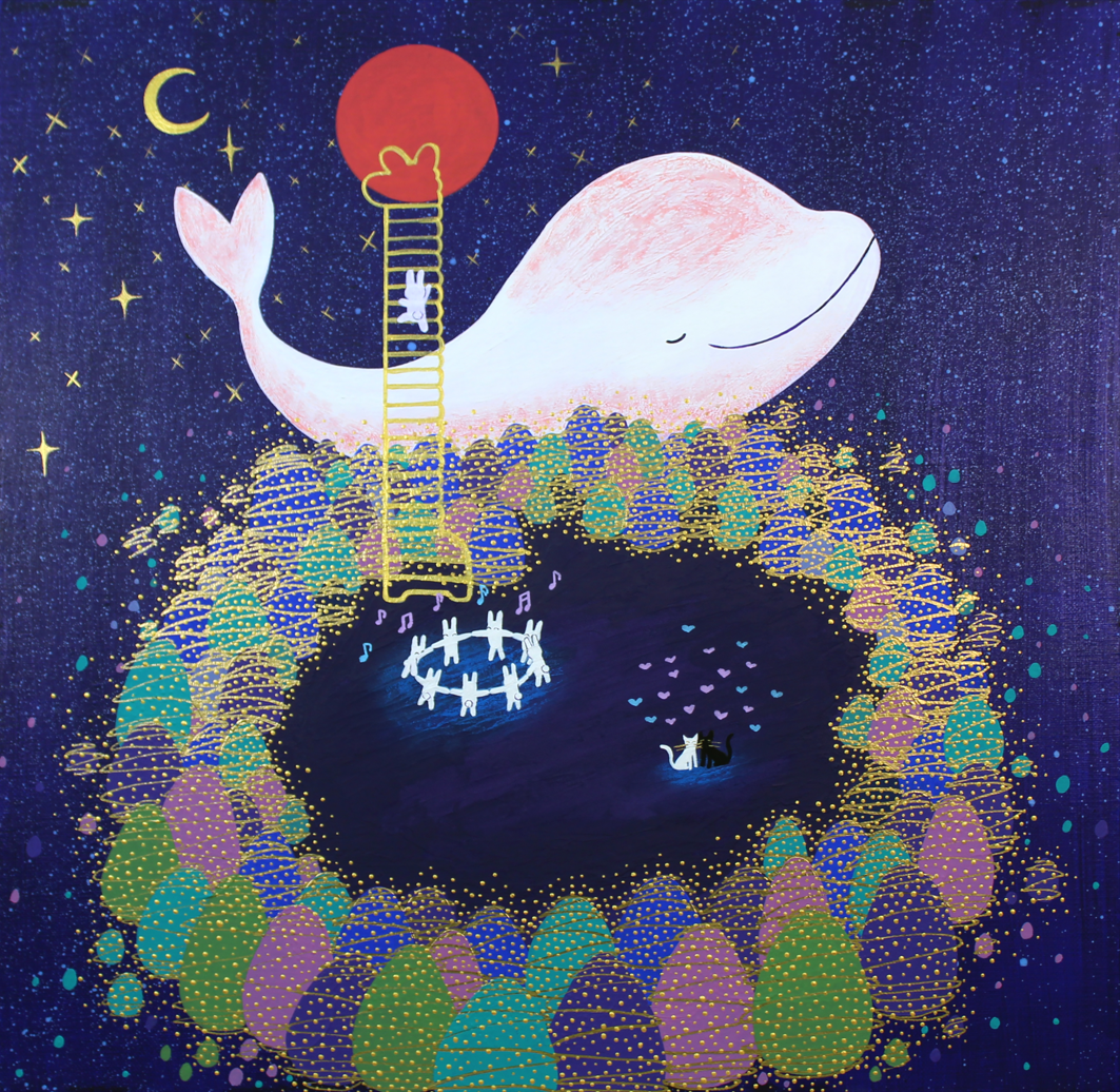 우리 삶은 전후 좌우 사방팔방으로 연결된다고 보았다. 그래서 내가 지배하는 것이 아니라 세상 만물이 서로 주고 받는 작은 힘으로 연결된다고 생각했다. 즉, 지금 이 순간은 내가 있어서 가능한 게 아니고 우주의 모든 것이 연결된 결과의 한 순간이며, 내가 존재하는 일도 그런 연결 속에서 필연적으로 나오는 결과라는 생각이다. 이렇게 신비로운 삶을 오로라 피어오르는 밤하늘을 배경 삼아 유영하는 고래로 표현하고 싶었다.