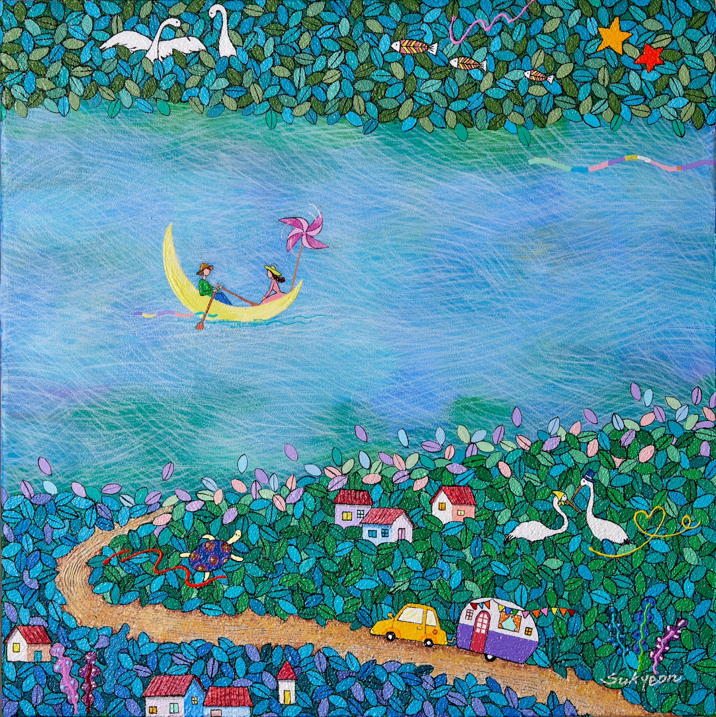 나는 상상의 시간 속 특별한 순간의 이미지를 좀더 명료하게 표현하기 위해 바람이라는 소재에 주목하게 되었다.무심결에 인식하지 못하고 지나치는 바람은 그 순간의 온도, 향기, 음악을 실어날라 특별한 아이덴티티를 만들어내기 때문이다. 바람에 실려온 따스한 온기, 향긋한 꽃 향기를 통해 봄의 정취를 느끼고, 시원하고 청량한 바다 바람을 통해 여름의 정취를 느끼듯이 바람은 그 장소와 시간이 가지는 뉘앙스를 오롯이 전달해준다. 나는 특별한 순간 속에서 느껴지는 생생한 감정들을 그림의 배경에 켜켜이 결을 내어 흘러가는 바람으로 표현하고자 하였다.